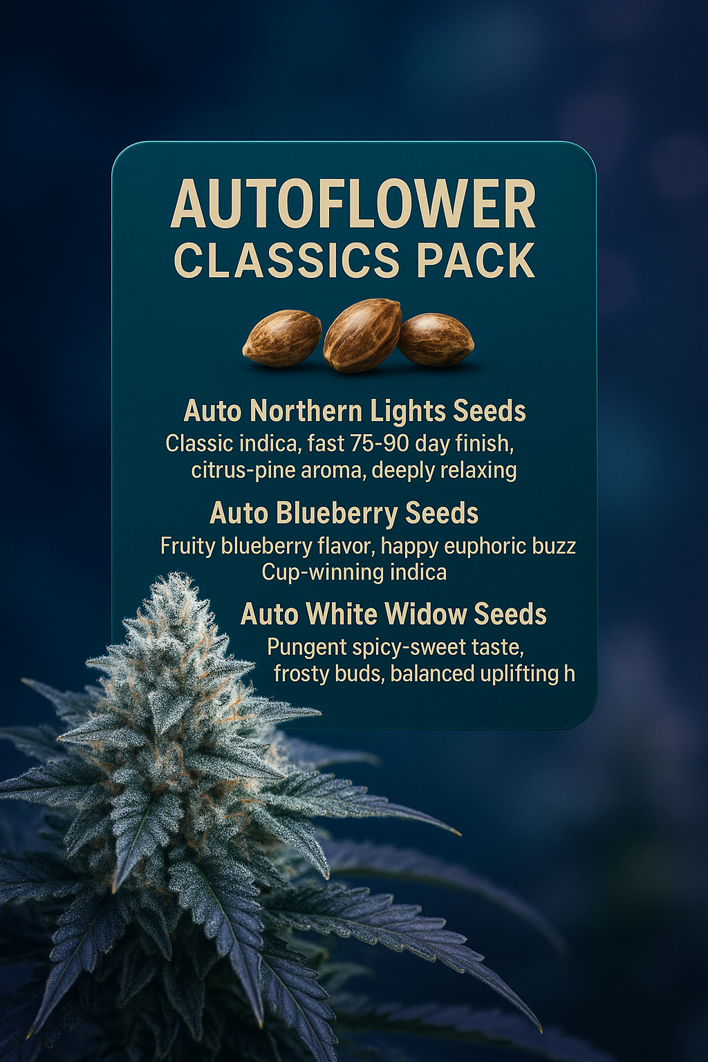 The Autoflower Classics Pack brings together three legendary strains in easy-grow autoflower form: Auto Northern Lights, Auto Blueberry, and Auto White Widow. This curated mix celebrates the all-time greats – from Northern Lights’ fast-finishing, deeply relaxing indica buzz to Blueberry’s award-winning fruity sweetness and White Widow’s balanced euphoria and resin-crusted buds.